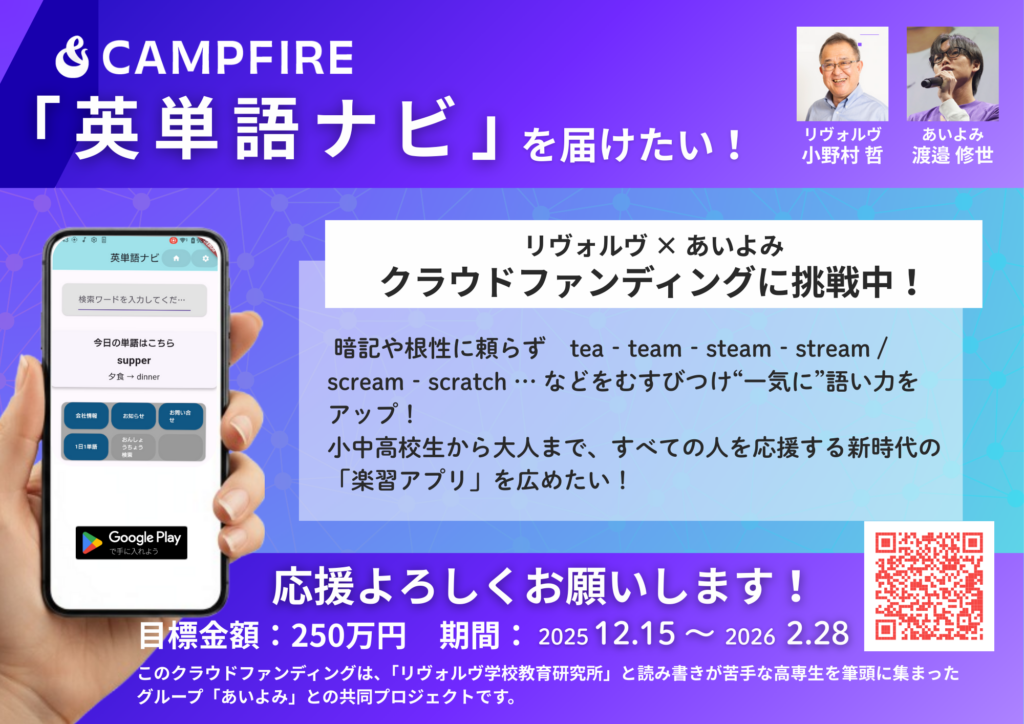 リヴォルヴ学校教育研究所 > 未分類 > クラウドファンディング開始!『つながる ハマる 止まらない!新時代の楽習アプリ「英単語ナビ」を届けたい!』