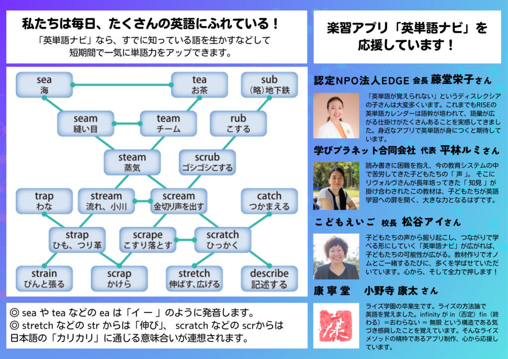 私たちは、独自の工夫を盛り込んだ「英単語ナビ」の普及を通じて、「英語読み書き困難」などへの理解も広げていきたいと考えています。