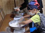 次に水をいれて捏ねます。まるで職人さんの様ですね。