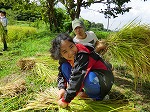 「刈った稲を紐で縛る係」を引き受けた女の子とスタッフのサダさん。緩まないように縛るには結構力がいりますね。