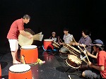 リーダーの柳瀬さんの1打を受け継ぎ、順に太鼓を打っていったところで、8ビートで基本リズムを打ち続ける組と柳瀬さんの指揮でフィルインする組に別れ、リズム打ちをしました。途中で組を交代しましたが、どちらもよくリズムをキープし、指揮をよく見て、思いっきり太鼓を叩き続けていました。