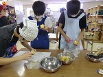 目指すは、耳たぶくらいの硬さです。こどもたちは、「あ、水を入れすぎた!もうちょっと粉を足したほうがいいかな。」などと言いながら、熱心にこねていました。