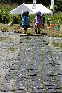 田んぼの雑草を押さえるために、紙マルチを敷きながら、その上から苗を植えていきます。