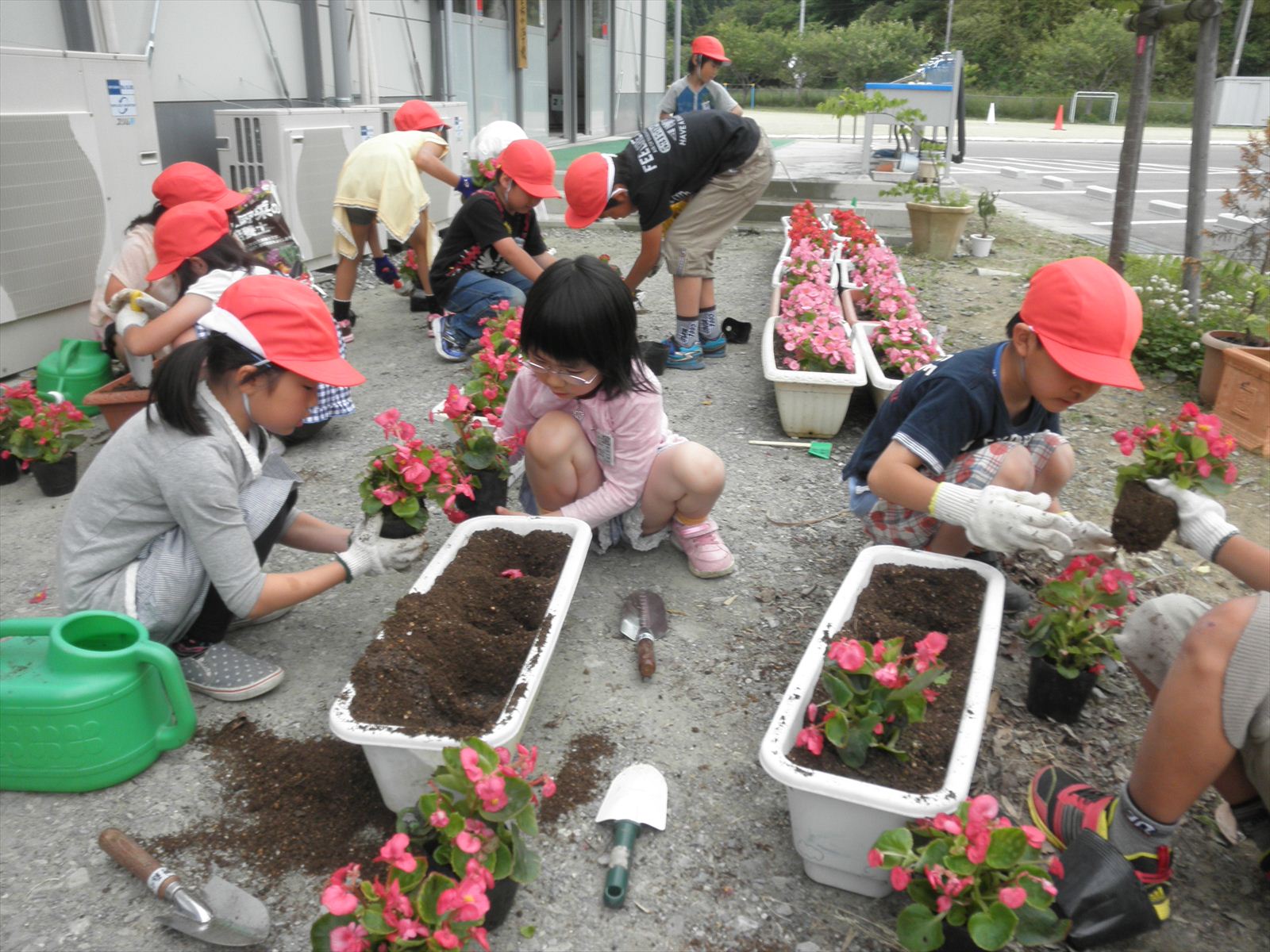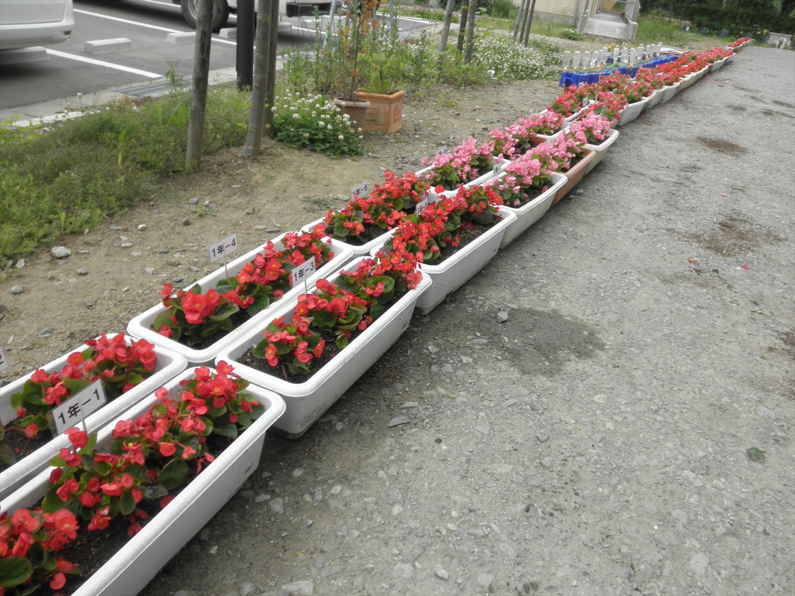 2回目は6月初旬にベコニアの花苗と培養土を届けていただきました。本校は花壇がないため、プランターへの植栽になりましたが児童の通学路に並べ、仮設校舎周辺がとても明るくなりました。