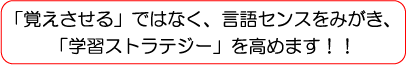 苦手にも,日本人ならではの傾向があります。その一つが「音韻的気づき」の不足であり、「h + at = hat 」「 hit – h = it 」 といった「音韻操作への不慣れ」です。30年近くにわたり子ども達と向き合いそのつまずきを見つめてきた経験と,最新の研究成果に基づく「英語カン」には,「外国語に対するセンス( 勘 / 感 )」をみがき,「真に自然な方法」で「自ら学び取る力」,「外国語学習ストラテジー」を伸長するための工夫がこらされています。