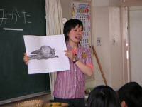 「絵=ものの・・・・・・」何だと思う?子ども達からは「もののけ姫!」との声が。(正解は「もののみかた」でした。)楽しい雰囲気で始まった授業は、えんぴつとねり消しゴムを生かすテクニックの練習、そして律子さんがあらかじめ用意してくれたどんぐりの木や枝、葉っぱの中から自分の好きなものを選んでスケッチ。カラスを描いた模倣作品は、子ども達の間からも驚きの声があがっていました。