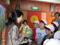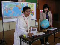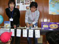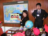 斉藤リリアナさん(ペルー)、五十嵐レナさん(ロシア)、魯霞さん(中国)、金姫貞さん(韓国)から、それぞれの国についてお話を伺いました。体育館の各コーナーをIt’s a small world の曲で移動すると、それはまるで小さな世界旅行!韓国の子ども達の遊び「にわとりゲーム」「チェギチャギ:はねけり」を楽しんだあとは、世界をもう一回りして、各国のクイズに挑戦しました。