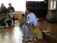 盲導犬を実際に見るのは初めて。「盲導犬も普通の犬と同じように家では吠えるんですよ」との話しにみんなびっくり!お話を聞いたあと、盲導犬のシンディーちゃんに触ったり、一緒に歩いてみたりと普段ではできない経験をしました。アイマスク歩行体験では、お父さん・お母さんも参加。一人はアイマスクをし、もう一人はガイド役になって階段やポールのあるコースを歩きました。子どもからは「暗くてとても恐かった。目が見えることのありがたさがわかりました」という感想がありました。